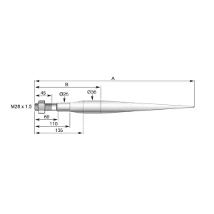 Sparex baggaspjót er sterkur teinn, lengd 2100 mm og skrúfufesting M28 x 1,50 (mm) – hannaður til notkunar þar sem öflug og áreiðanleg tenging við grindina skiptir máli.