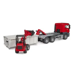 Vörubíll úr MAN TGS línunni með krókakerfi sem losar og setur á kassa, ásamt Schäffer hjólaskóflu sem fylgir með. Báðar vélarnar eru í 1:16 skala með hreyfanlegum hlutum og sterkri ABS-smíði, fullkomnar fyrir byggingar- og flutningsleik bæði inni og úti.