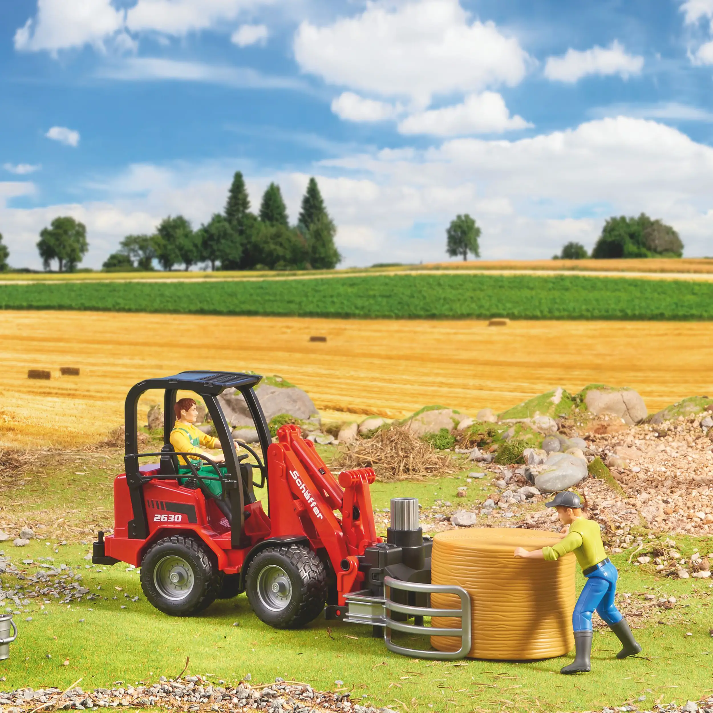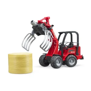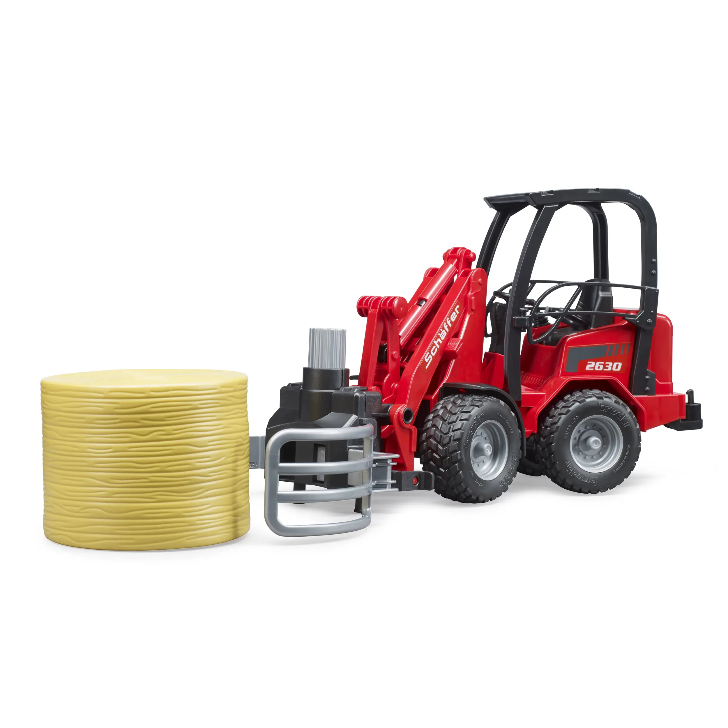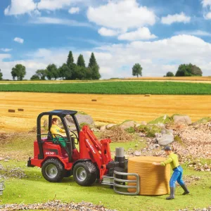 Bruder Schäffer 2630 er lipur og öflugur kompakt lyftari sem kemur með rúllubaggagripi og einum rúllubagga. Frábært leikfang fyrir búleik og vinnuverkefni þar sem flytja, lyfta eða stafla þarf hey.